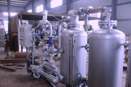 当闭式凝水箱中冷凝水处于高水位时,压力调节阀和凝水泵同时开启,凝水泵将冷凝水输送到锅炉或除氧器中,凝水箱依靠压力调节阀供入的蒸汽来保证一定的压力,该压力正好与凝水泵输送的冷凝水所需要的防气蚀压力头相对应。以保证泵工作时不产生气蚀现象。低水位值时,凝水泵和压力调节阀9同时关闭,而压力阀调节开启,将蒸汽排入汽水换热器中,同时,凝水箱中卸压以使冷凝水能重新进入。如此重复循环,实现了高温冷凝水回收,并解决了离心泵的附加防气蚀压头问题。