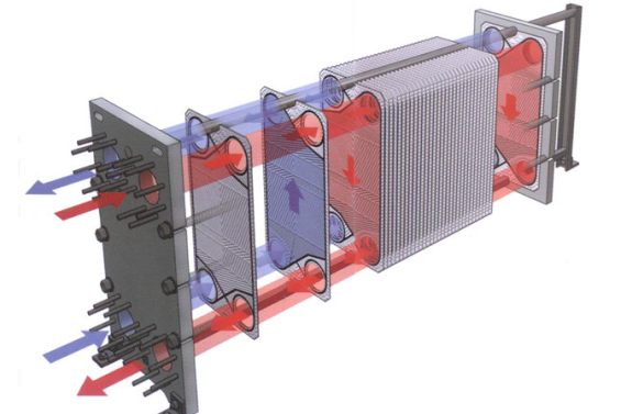 流程组合形式应根据换热和流体阻力计算,在满足工艺条件要求下确定。尽量使冷、热水流道内的对流换热系数相等或接近,从而得到最佳的传热效果。