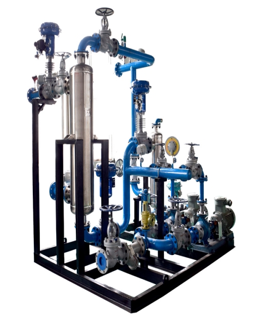 换热机组是由换热器、温控阀组、疏水阀组(热媒为蒸汽时)循环泵、电控柜、底座、管路、阀门、仪表等组成,并可加装膨胀罐、水处理设备、水泵变频控制、温控阀、远程通讯控制等,从而构成一个完整的热交换站。换热机组具有标准化、模块化的设计,配置齐全,安装方便、高效节能。换热机组结构紧凑、运行可靠、操作简便直观等优点,是首选的高效节能产品。该产品适应于住宅、机关、厂矿、医院、宾馆、学校等场合的卫生热水。整体式换热机组既可用于水—水交换,也可用于汽—水交换。